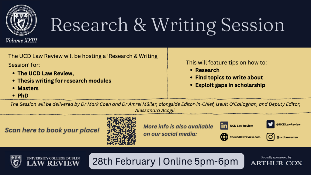 Get your tickets now for the UCD Law Review Research and Writing Session Posted byucdlawreviewFebruary 26, 2023February 26, 2023Posted inNews Register on EventbriteShare this: Click to share on X (Opens in new window) X Click to share on Facebook (Opens in new window) Facebook Like Loading... Related
